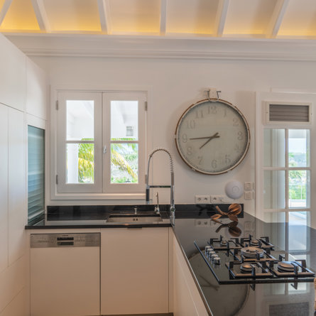 Refrigerator, microwave, toaster, dishwasher, blender, coffee machine, Nespresso machine, oven, kettle, gas stove, juicer, ice-cube maker, dining table seating (8)