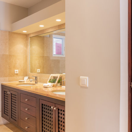 Ensuite bathroom with 2 sinks and a walk-in shower with a step -