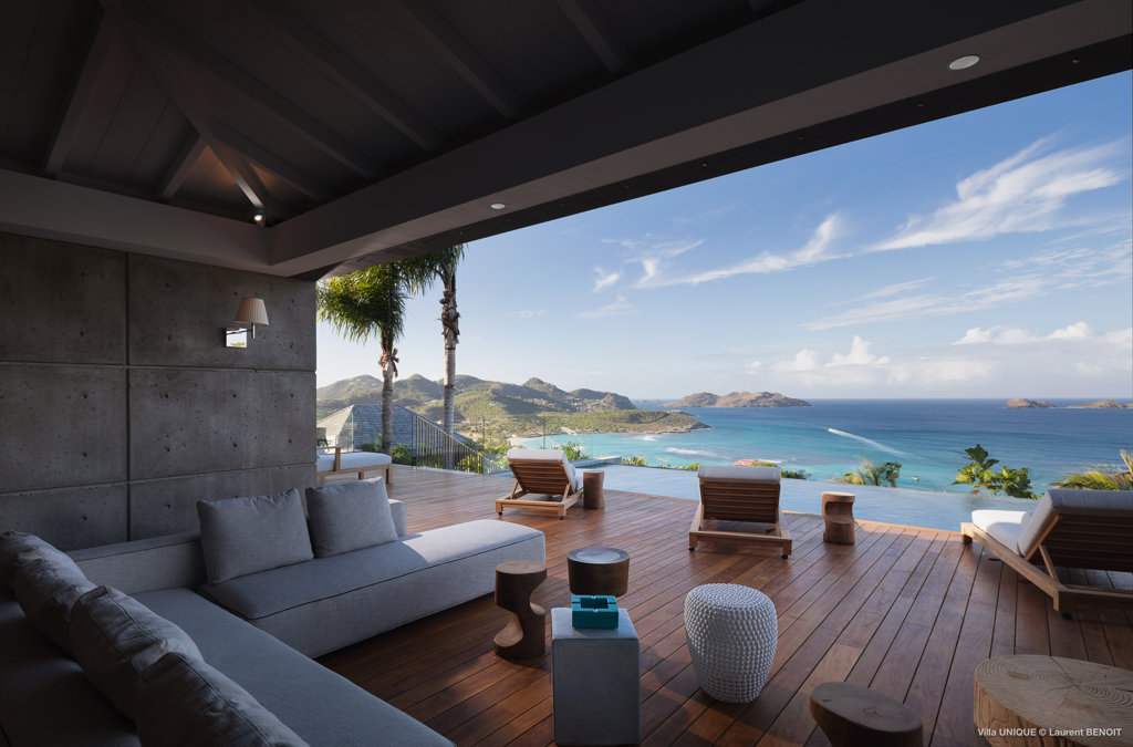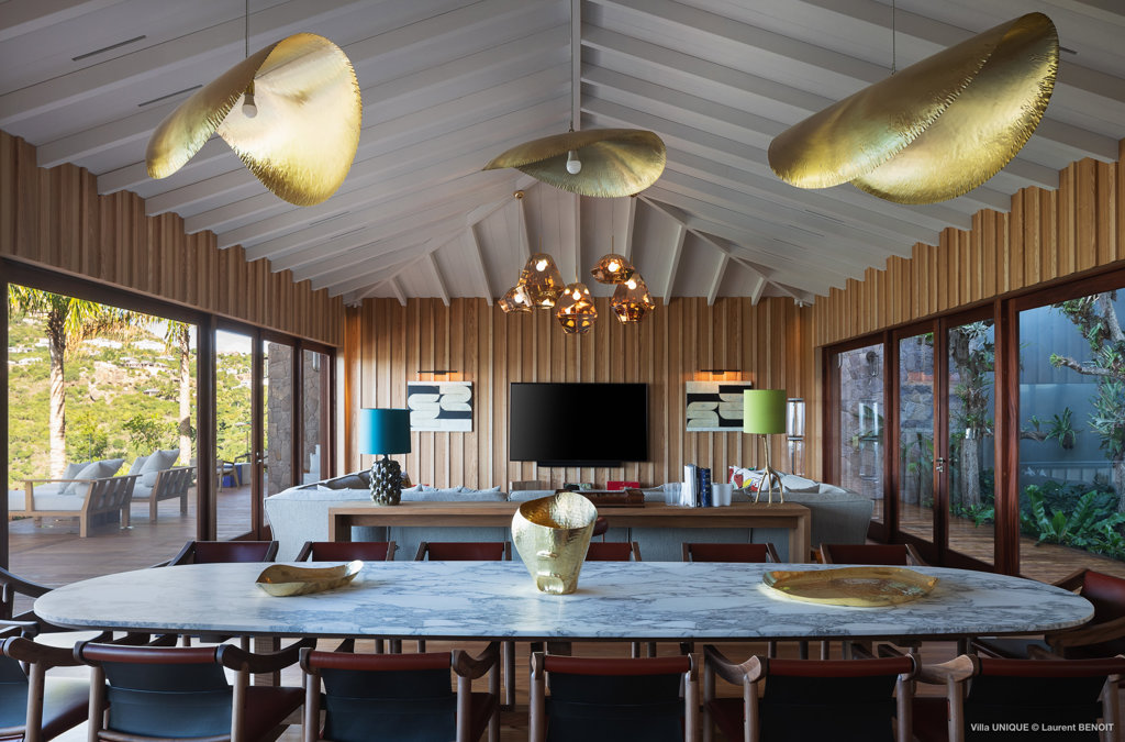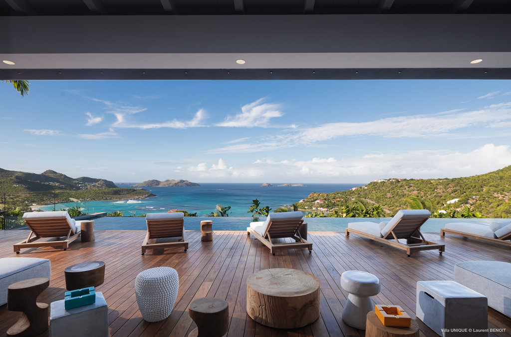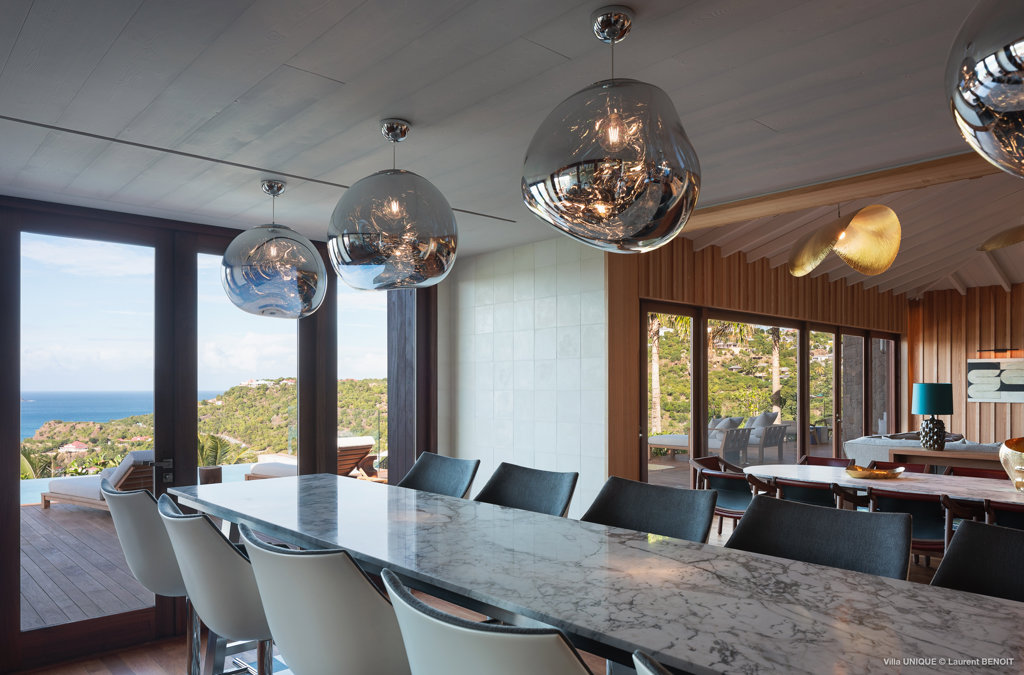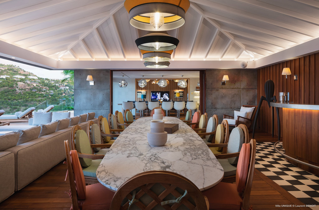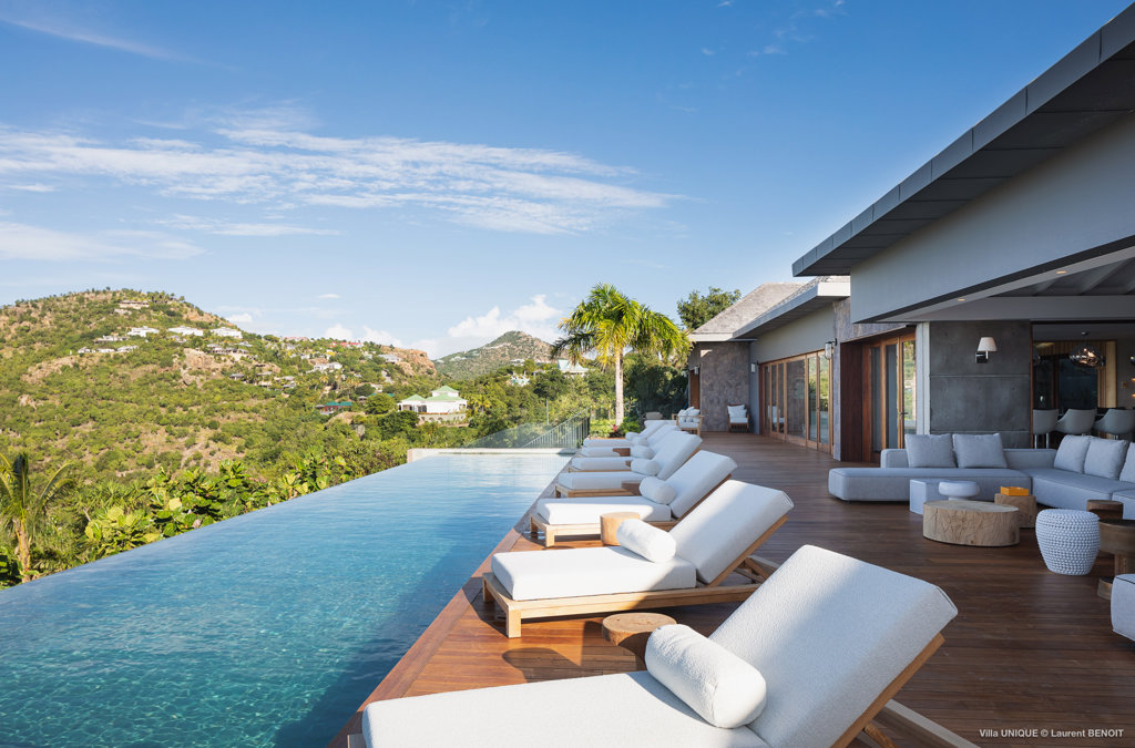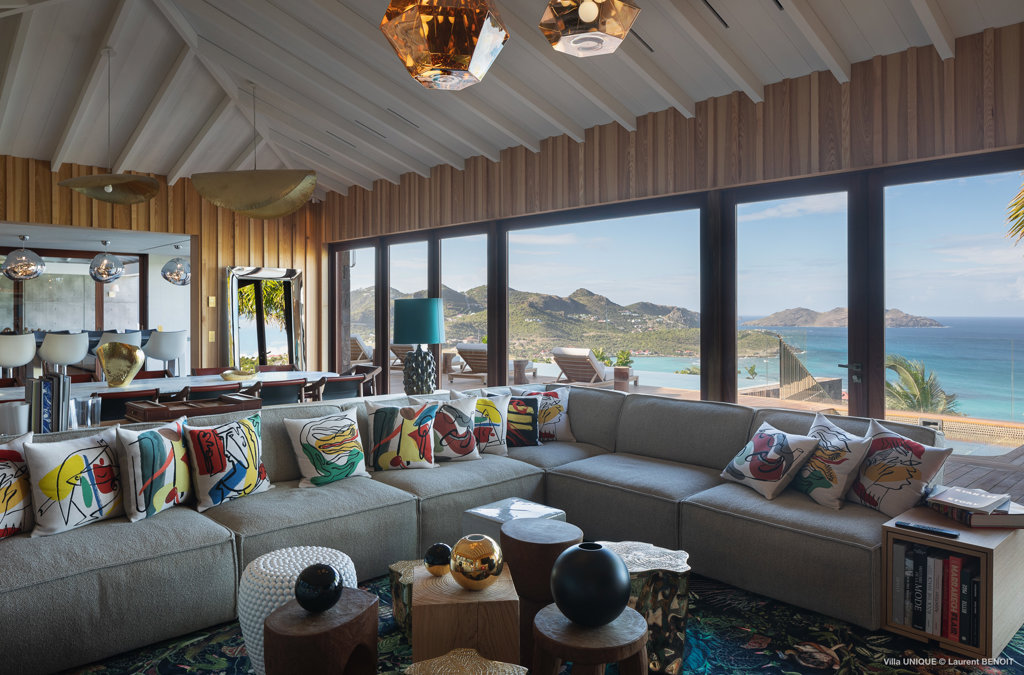 Philippe Starck designed St Jean’s Villa Unik as a modern vacation home for a group of friends or multigenerational family thanks to ten bedrooms and three distinct blocks for both spaciousness and privacy, a theatre room and fitness area, while its hillside location offers pristine views over St Jean Bay and Eden Rock – St Barths, which is only a short distance away.