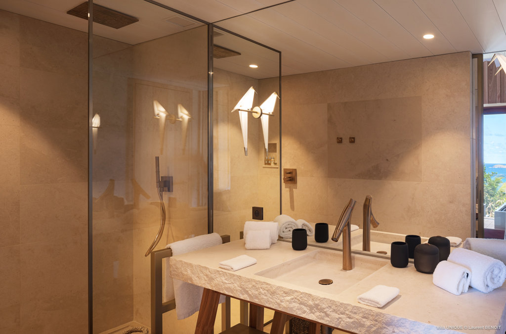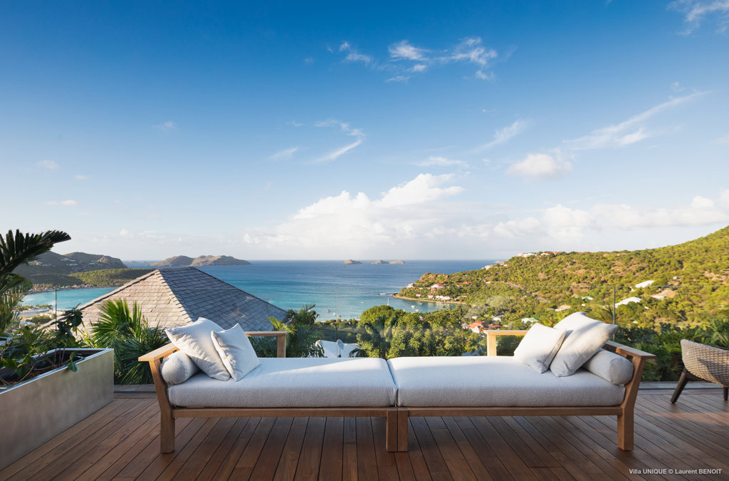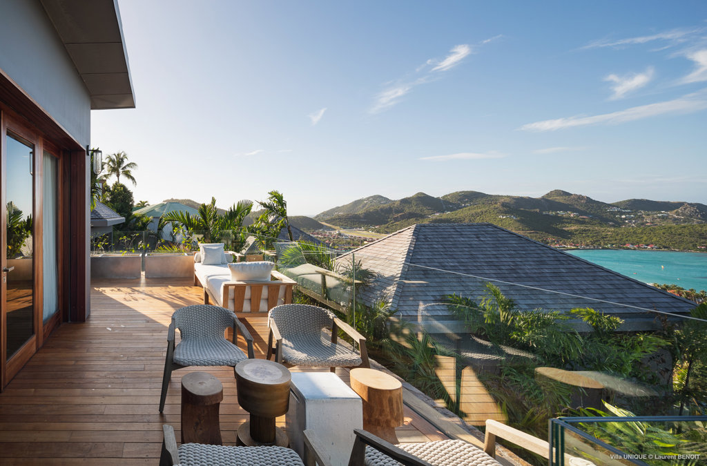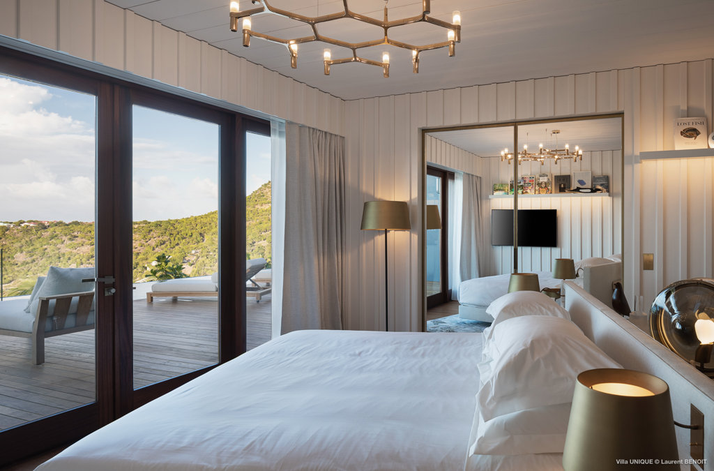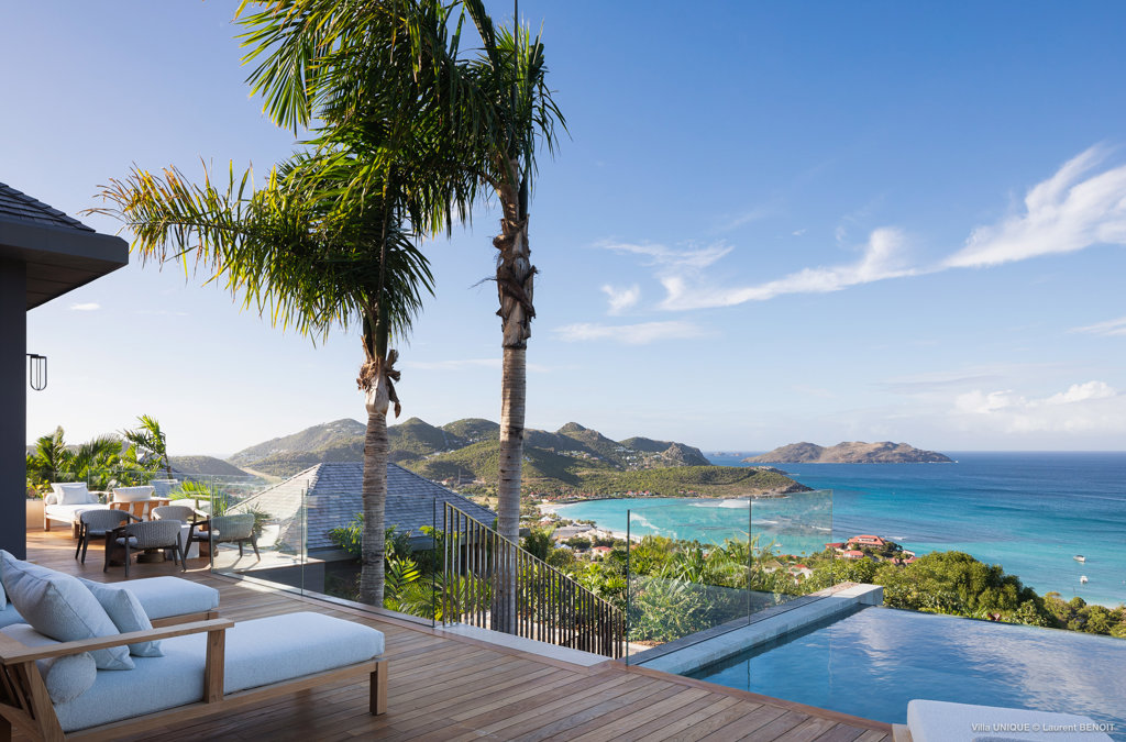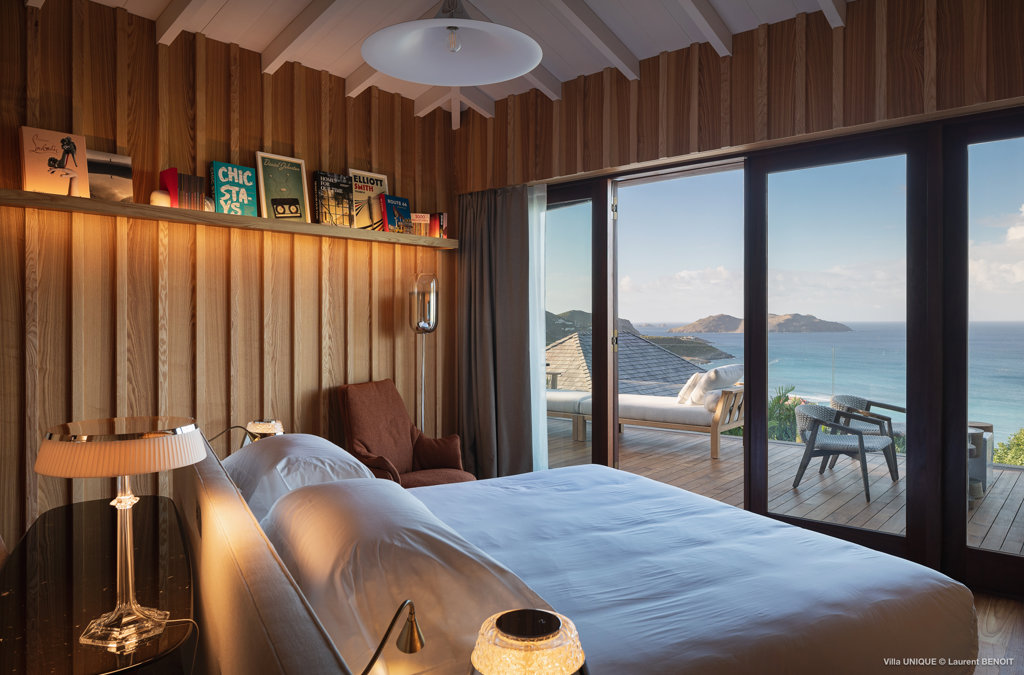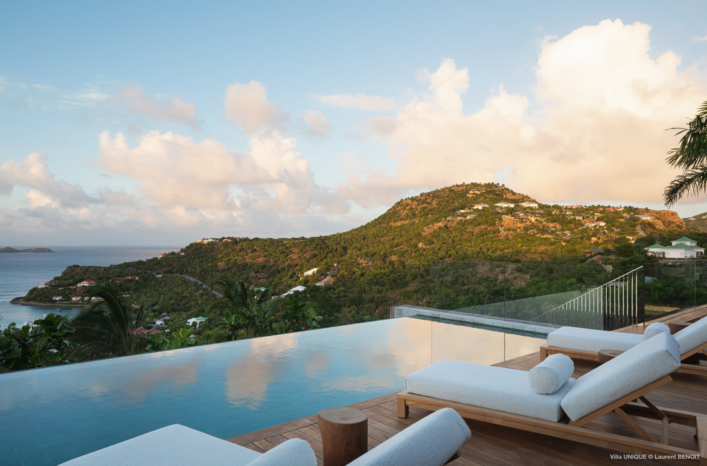 Philippe Starck designed St Jean’s Villa Unik as a modern vacation home for a group of friends or multigenerational family thanks to ten bedrooms and three distinct blocks for both spaciousness and privacy, a theatre room and fitness area, while its hillside location offers pristine views over St Jean Bay and Eden Rock – St Barths, which is only a short distance away.