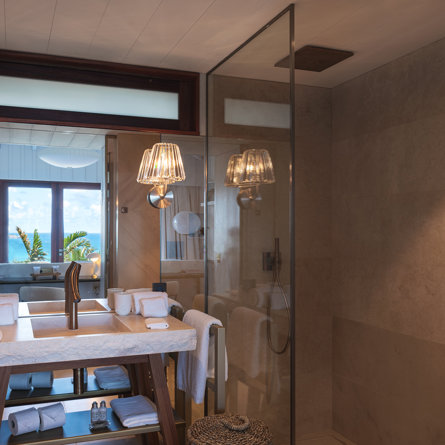 Bedroom 4 A/C, sea view, King-size bed, TV and Apple TV, Dish satellite, surround-sound, closet, safe, en-suite bathroom with shower, 2 sinks, toilets, hair dryer.