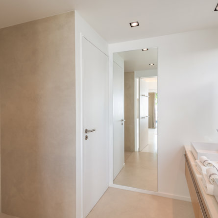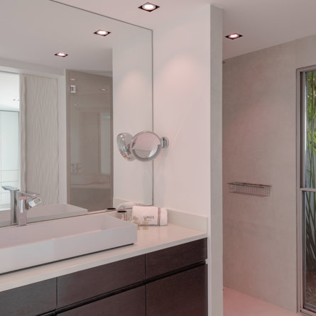 Open bathroom, Walk-in shower, Two sinks, Hair dryer, Separate toilet.