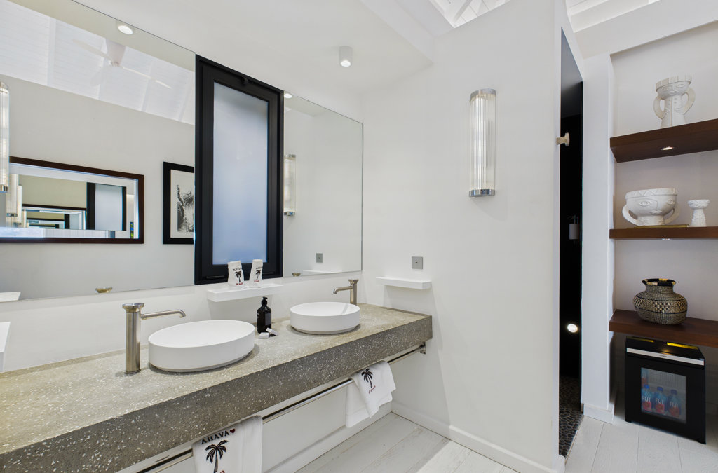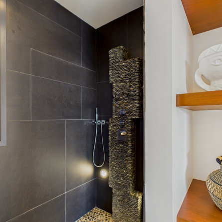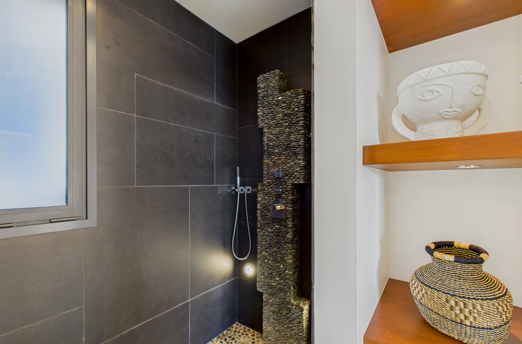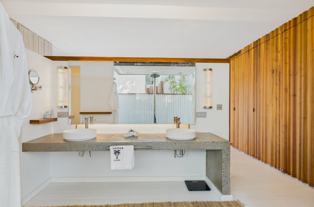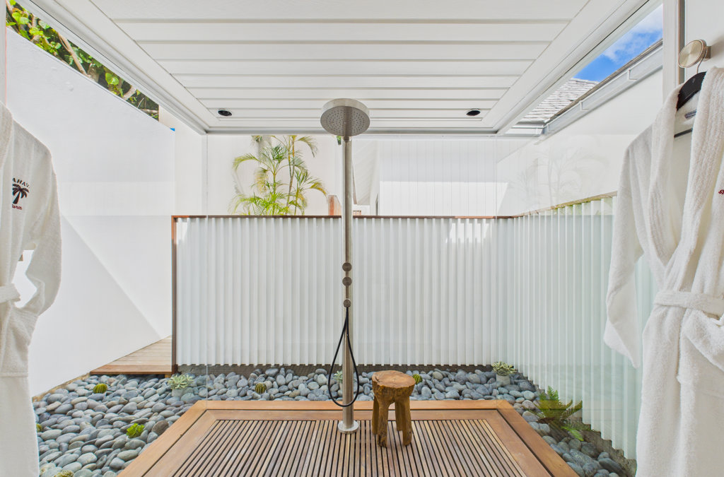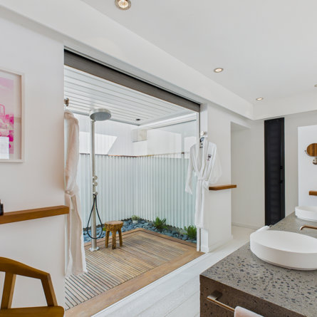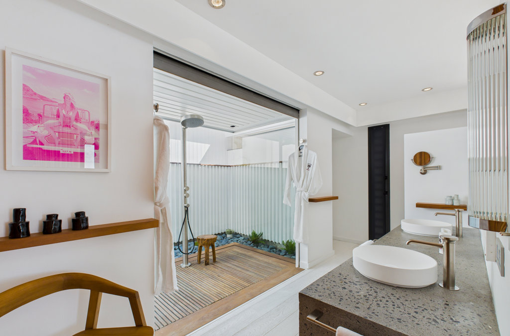 Salle de bain ouverte, Douche à l'italienne, Douche extérieure, Deux lavabos, Sèche-cheveux, Toilette ouverte.