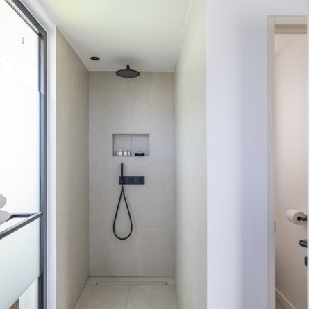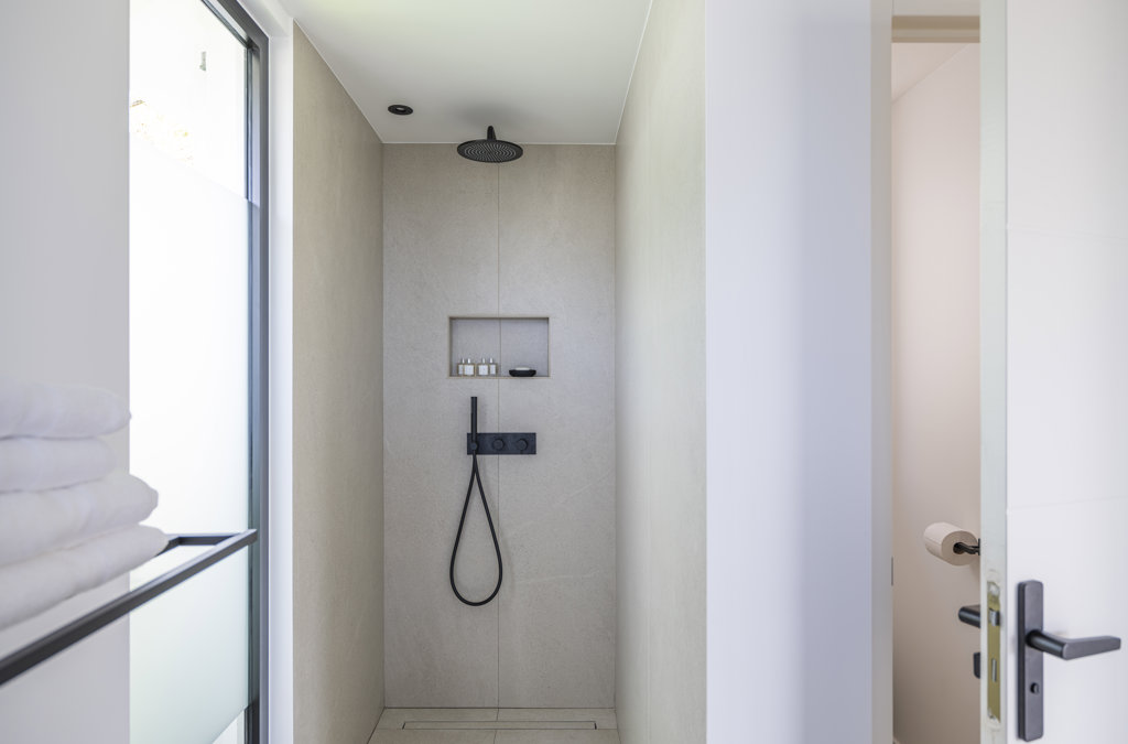 Salle de bain attenante, Douche à l'italienne, Lavabo, Sèche-cheveux, Toilettes fermées.