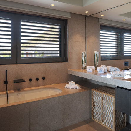 Salle de bain attenante, Douche à l'italienne, Baignoire, Deux lavabos, Sèche-cheveux, Toilettes fermées.