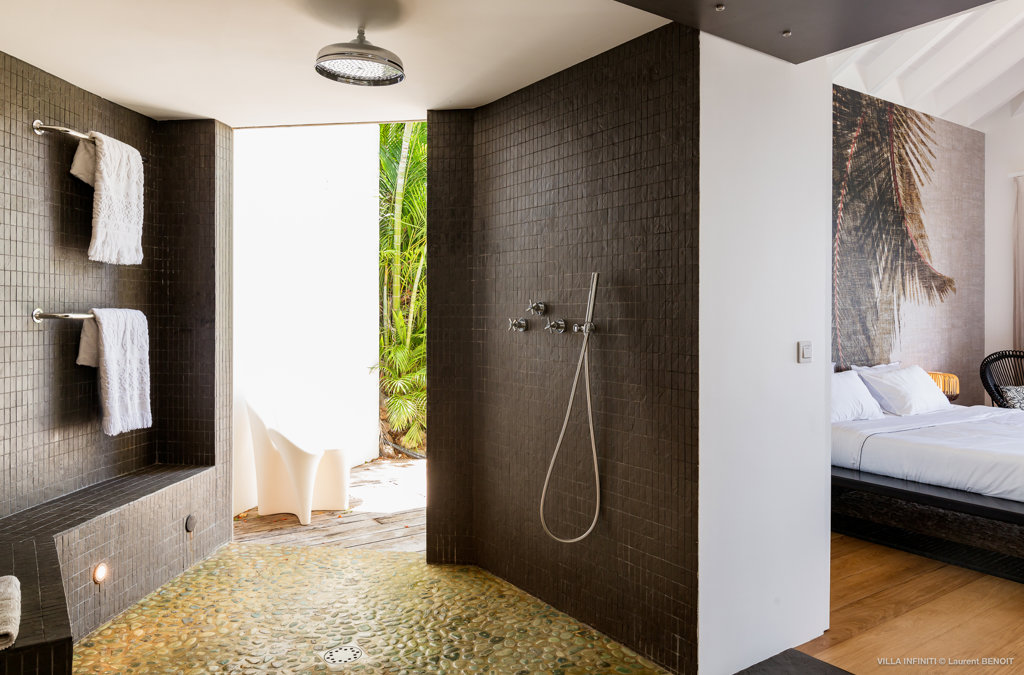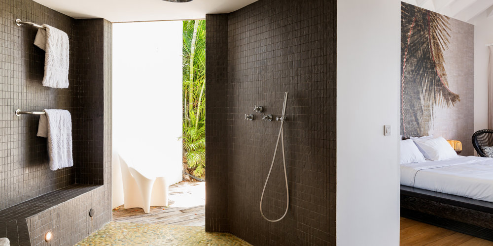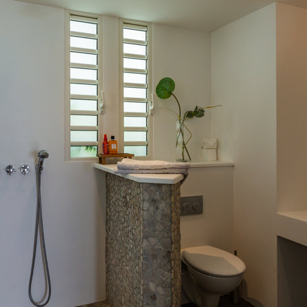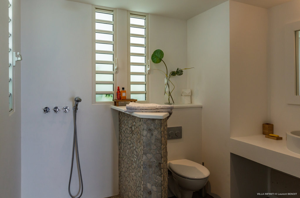 Salle de bain ouverte, Douche à l'italienne, Lavabo, Sèche-cheveux, Toilettes ouvertes.