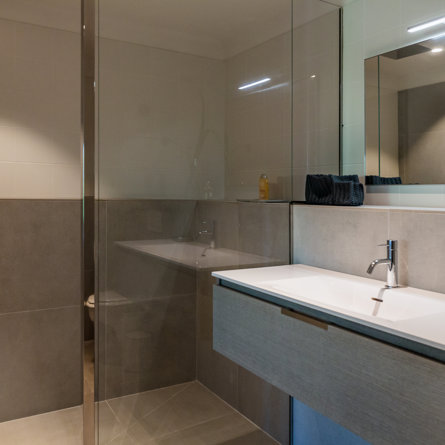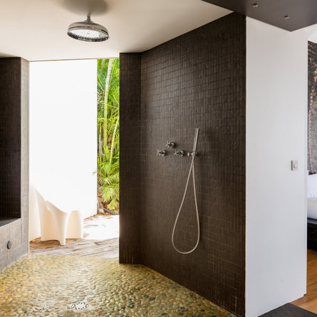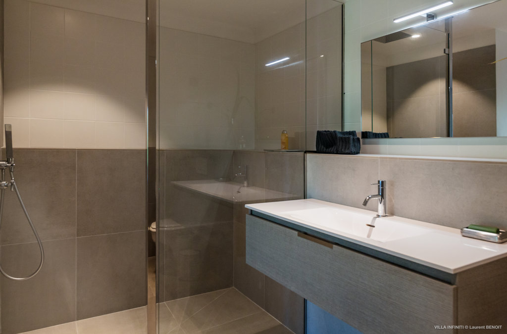 Salle de bain ouverte, Douche à l'italienne, Lavabo, Sèche-cheveux, Toilettes fermées.