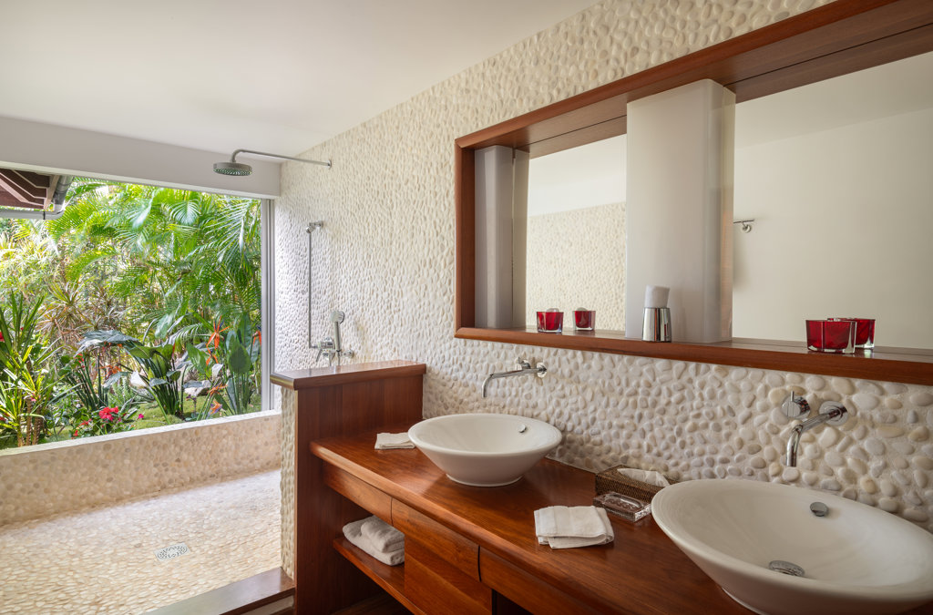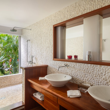 Salle de bain attenante, Douche extérieure, Deux lavabos, Sèche-cheveux, Toilettes.