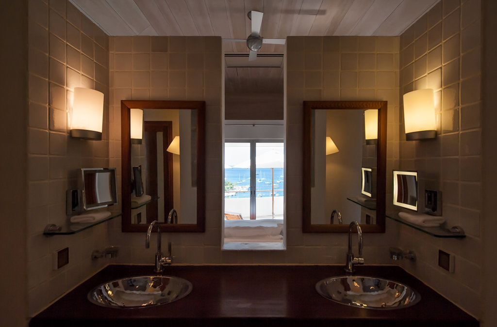 Salle de bain ouverte, Douche, Deux lavabos, Toilettes séparées.