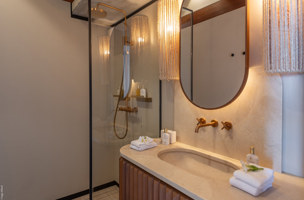 Salle de bain attenante, Douche à l'italienne, Douche extérieure, Deux lavabos, Sèche-cheveux, Toilette ouverte.