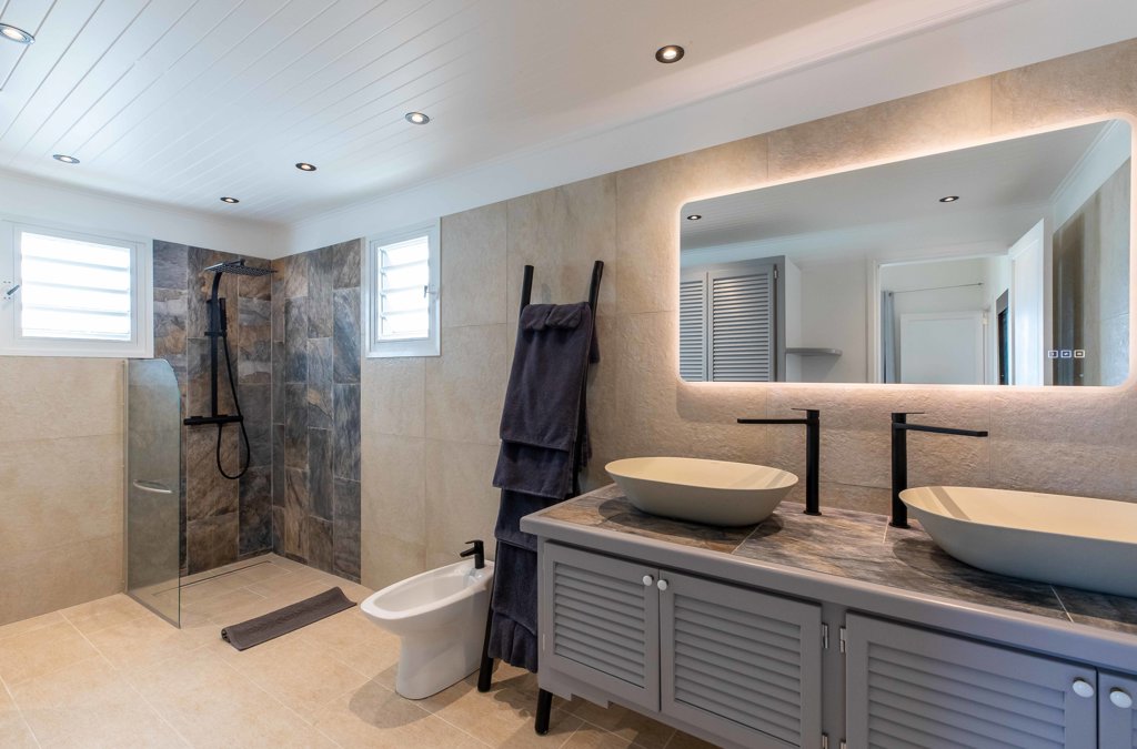 Salle de bain attenante, Douche à l'italienne, Deux lavabos, Sèche-cheveux, Toilettes ouvertes.
