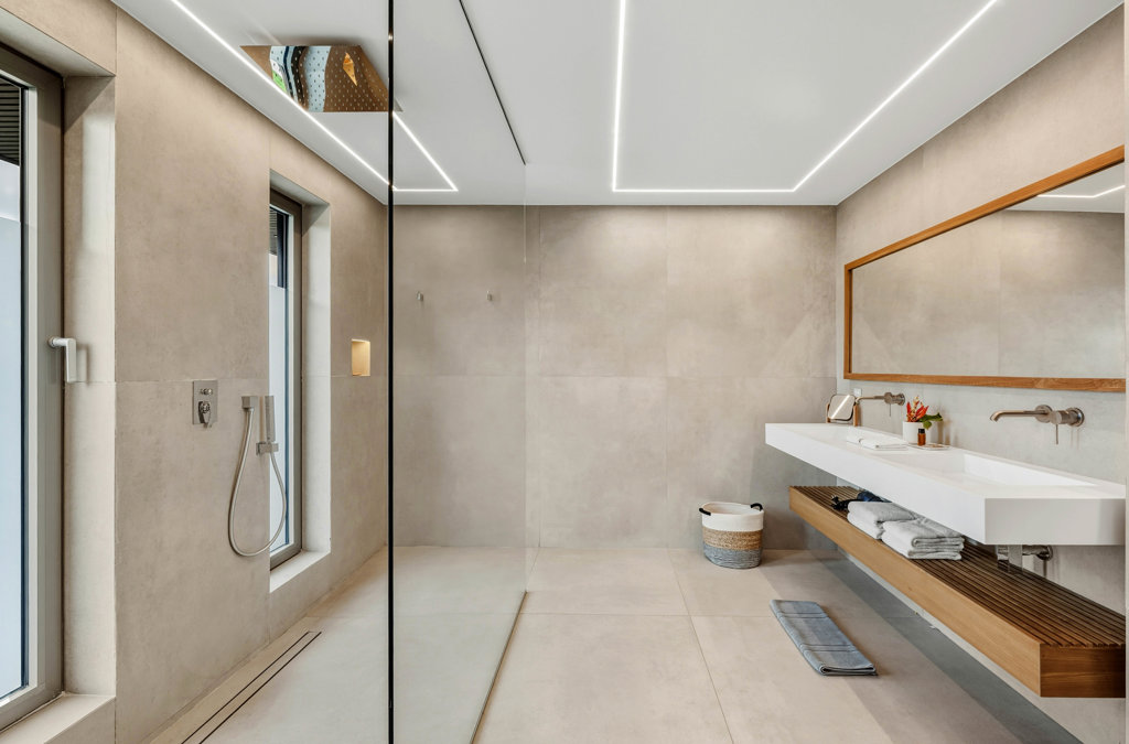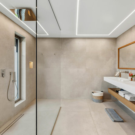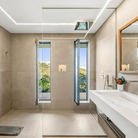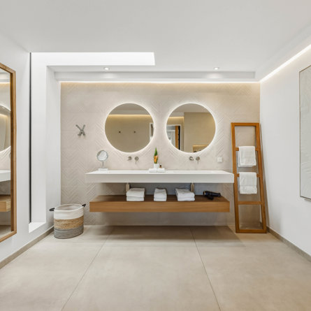 Salle de bain attenante, Douche à l'italienne, Deux lavabos, Sèche-cheveux, Toilette ouverte.