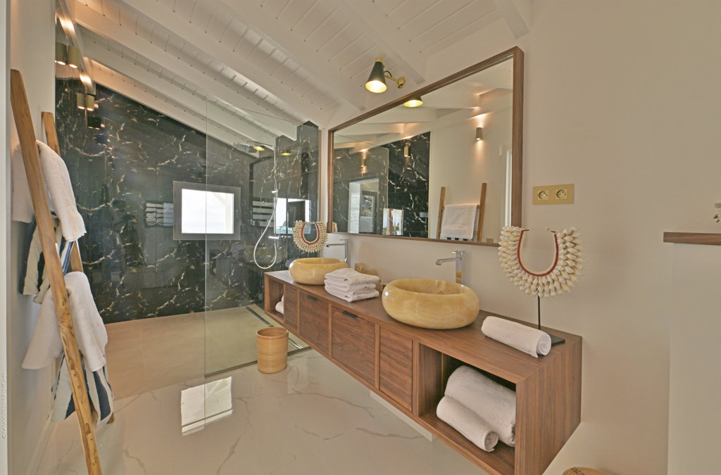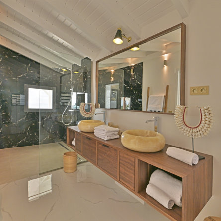 Salle de bain attenante, Douche à l'italienne, Douche extérieure, Jacuzzi, Deux lavabos, Sèche-cheveux, Toilettes.