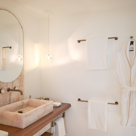 Salle de bain attenante, Douche à l'italienne, Douche extérieure, Deux lavabos, Sèche-cheveux, Toilette fermée.