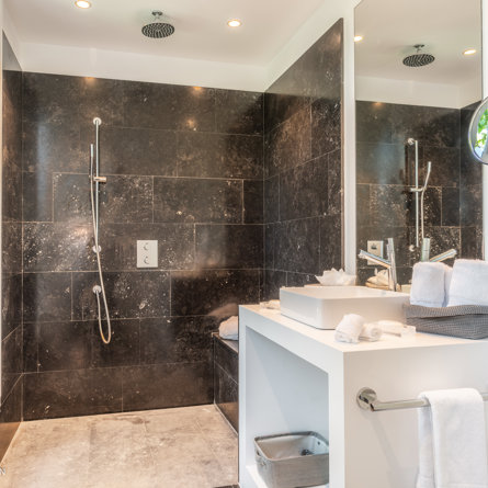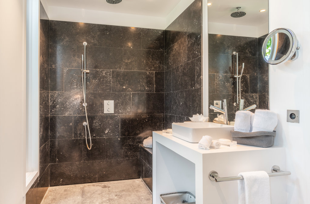 Salle de bain attenante, Douche à l'italienne, Lavabo, Sèche-cheveux, Toilettes fermées.