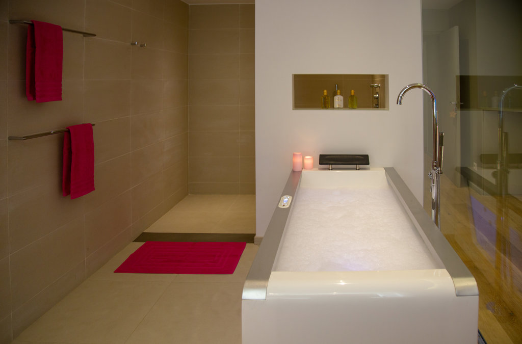 Salle de bain attenante, Douche à l'italienne, Baignoire, Deux lavabos, Toilettes.