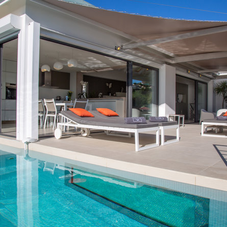 Vue mer & montagne, Terrasse, Piscine chauffée, Bains de soleil, Salon de jardin, Système de son, Barbecue.