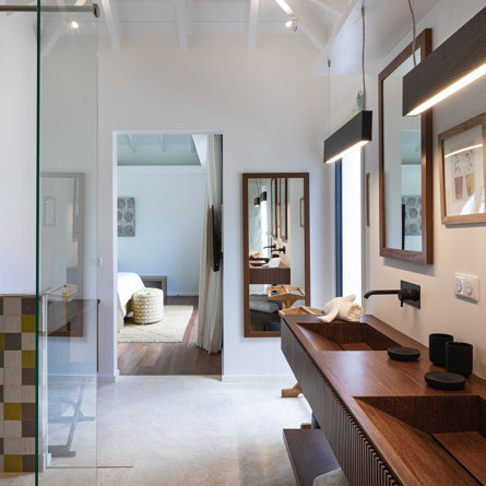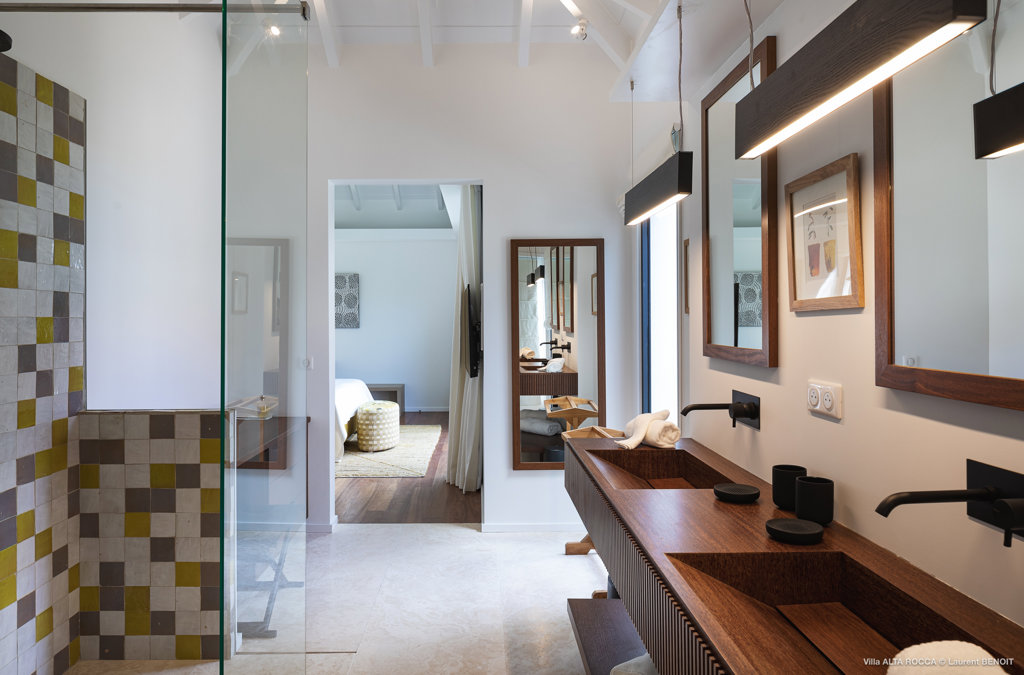 Salle de bain attenante, Douche à l'italienne, Douche extérieure, Deux lavabos, Sèche-cheveux, Toilettes.