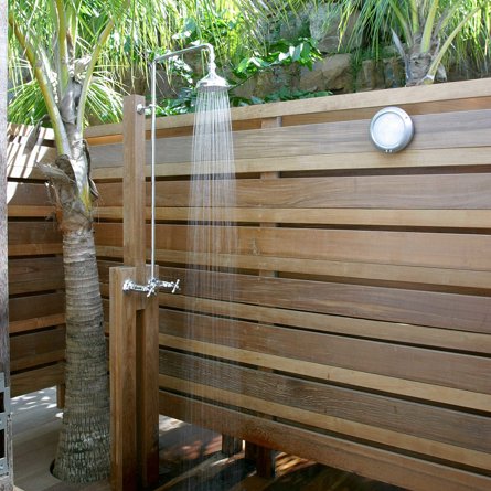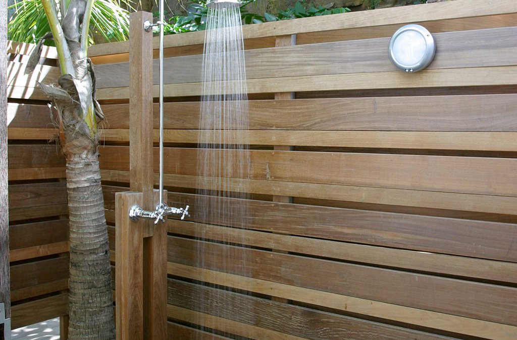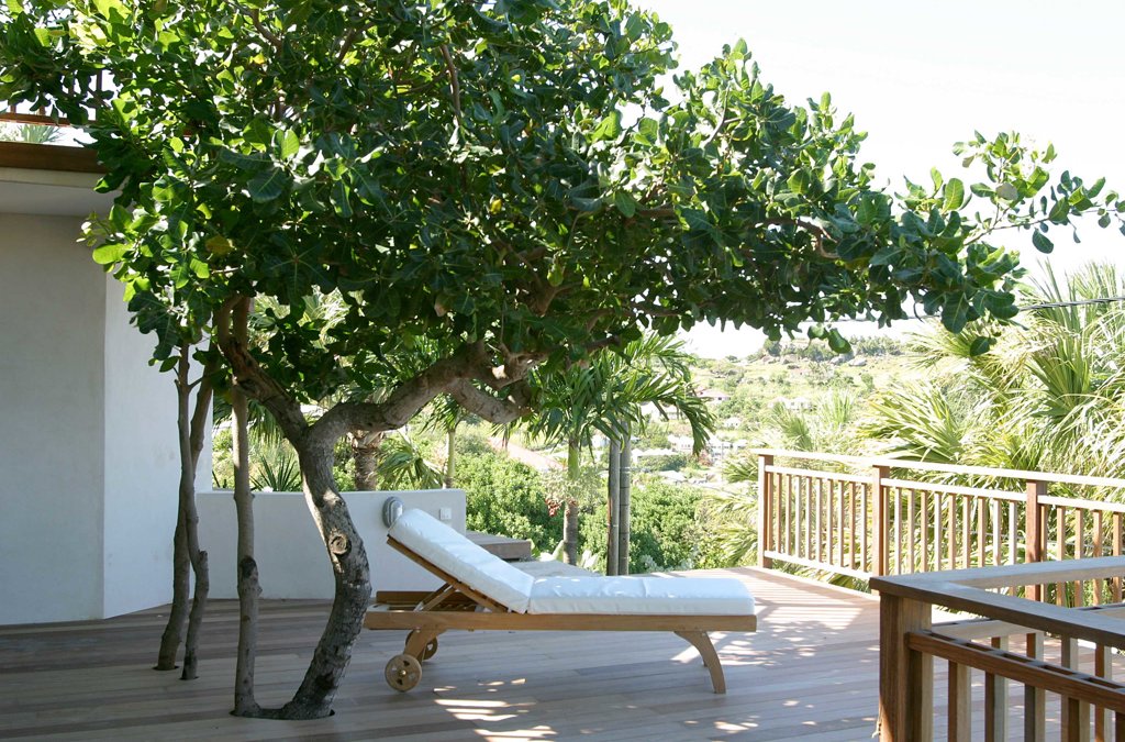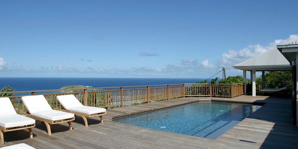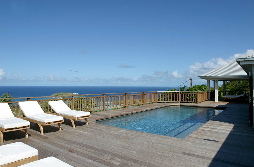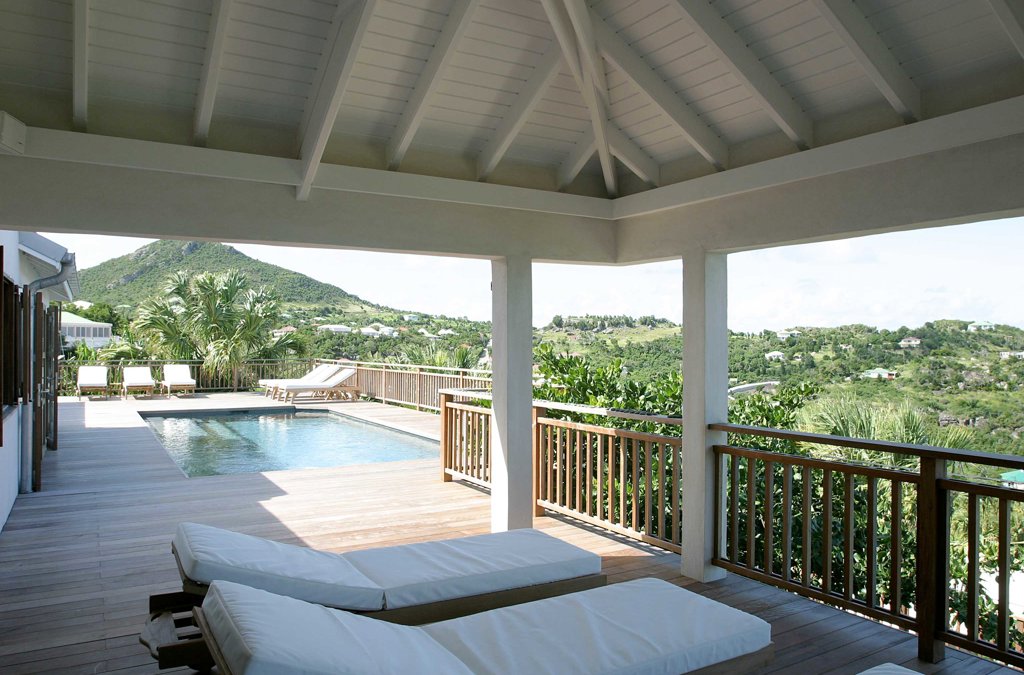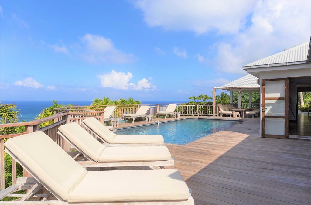 Spacieuse terrasse avec vue mer, transats et douche extérieure.