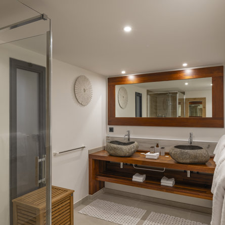 Salle de bain attenante, Douche, Deux lavabos, Sèche-cheveux, Toilettes ouvertes.