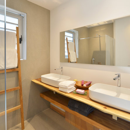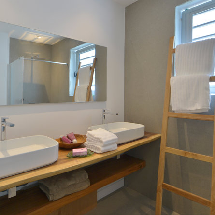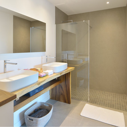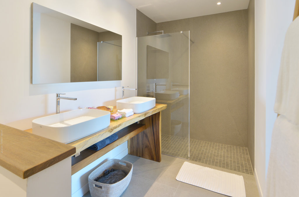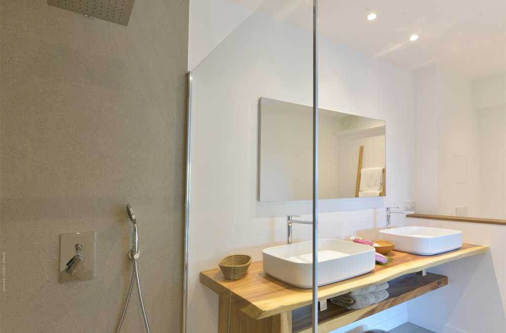 Salle de bain attenante, Douche à l'italienne, Deux lavabos Sèche-cheveux, Toilettes ouvertes.