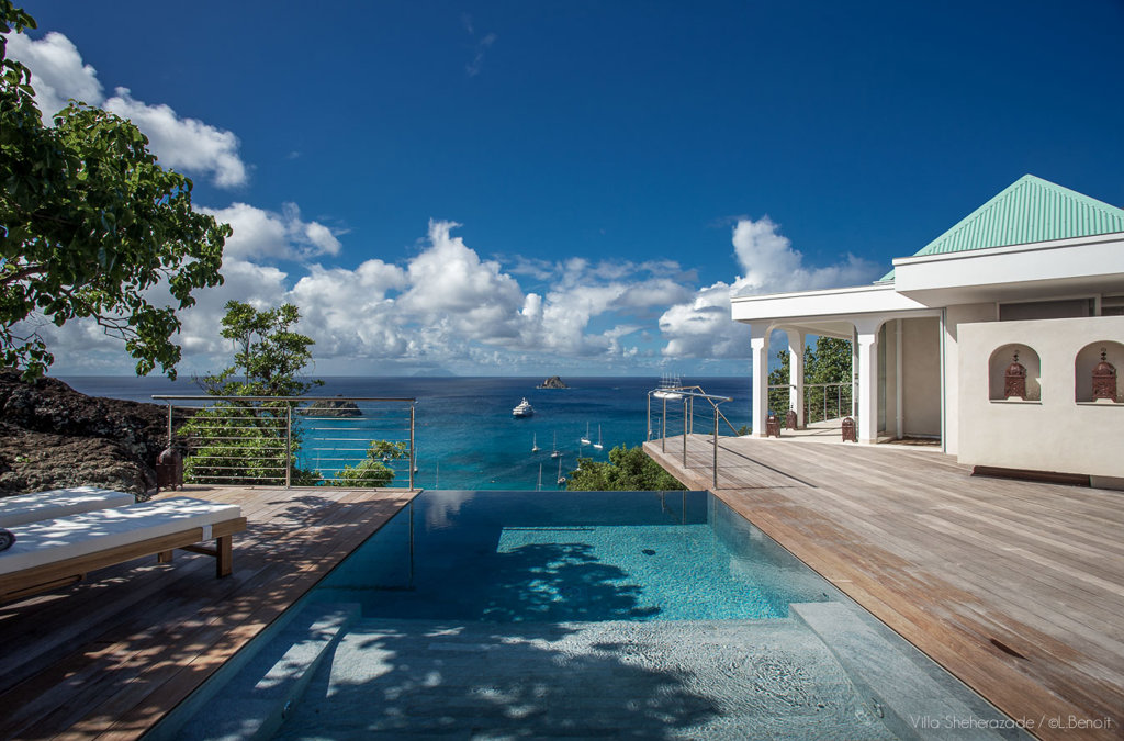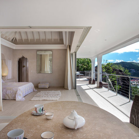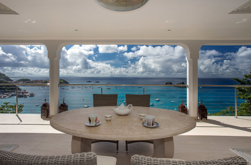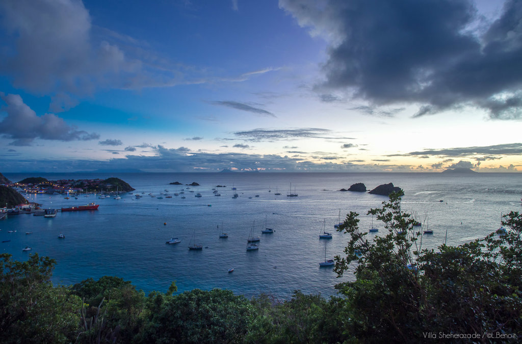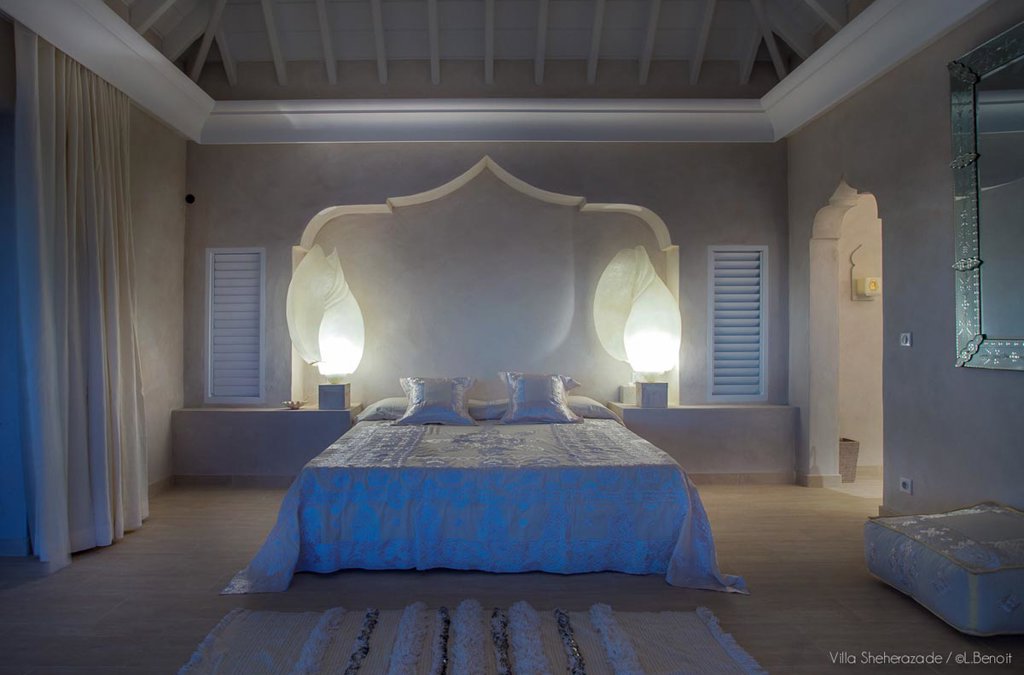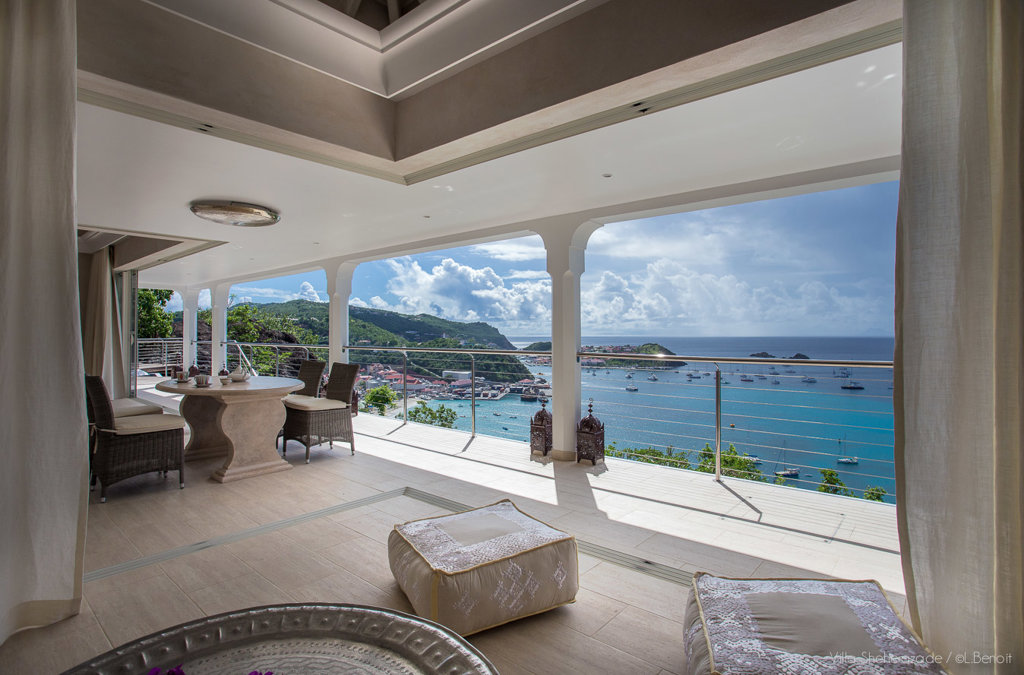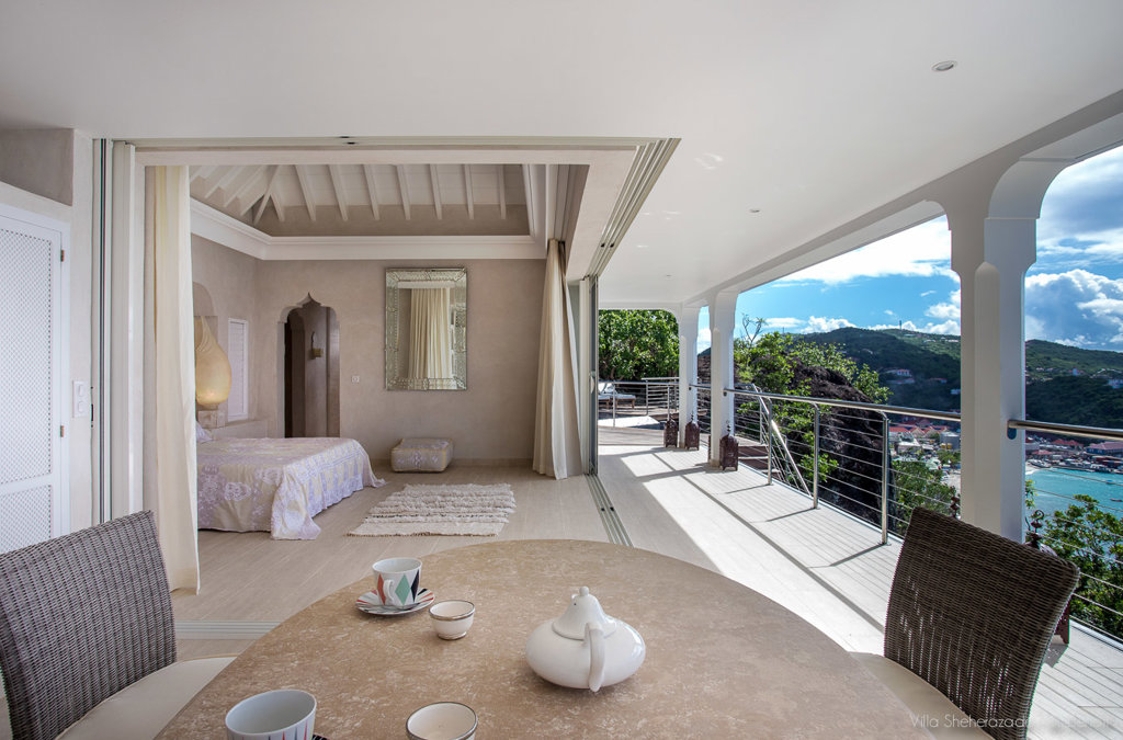Dans la villa Sheherazade dont l’accès se fait par des escaliers, le dépaysement est garanti : une ambiance orientale où toutes les pièces sont ouvertes sur l’extérieur et donnent sur Gustavia, permettant ainsi de profiter de sublimes couchers de soleil qui raviront forcément les jeunes couples en lune de miel.