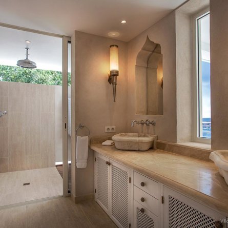 Salle de bain attenante, Douche à l'italienne, Douche extérieure, Deux lavabos, Sèche-cheveux, Toilettes fermées.
