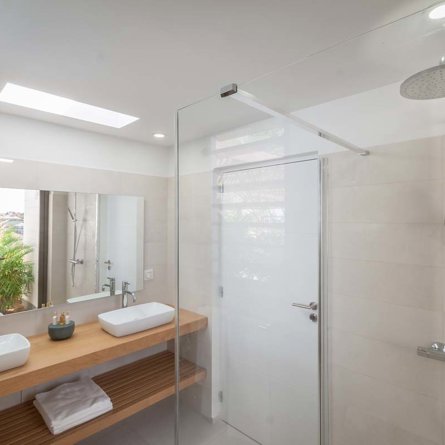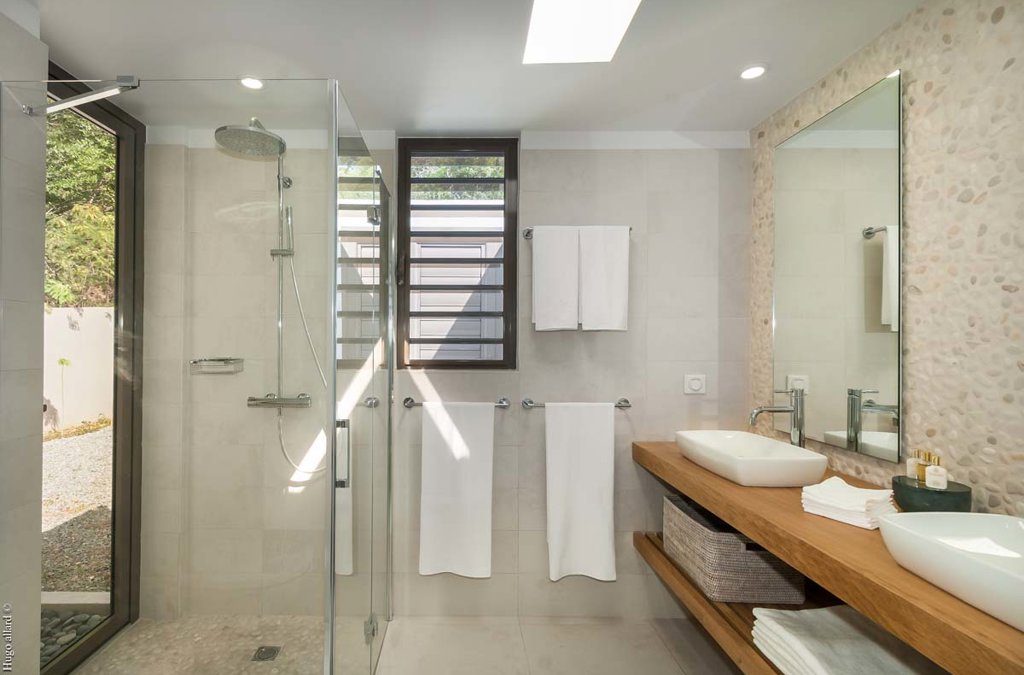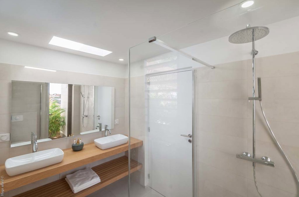 Salle de bain attenante, Douche à l'italienne, Douche extérieure, Deux lavabos, Sèche-cheveux, Toilettes ouvertes.