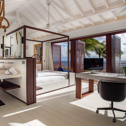 Lit double, télévision, satellite, coffre-fort, air conditionné, terrasse privée, vue mer. Salle de bain adjacente, 2 vasques, douche à l'italienne, douche extérieure, sèche-cheveux