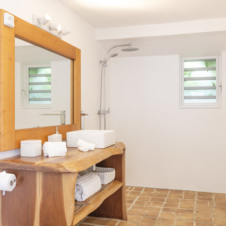 Salle de bain ouverte, Douche à l'italienne, Lavabo, Sèche-cheveux, Pèse-personne, Toilettes.