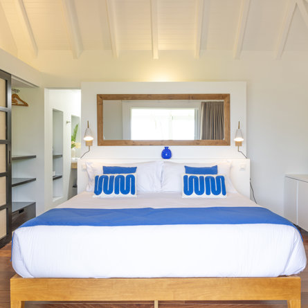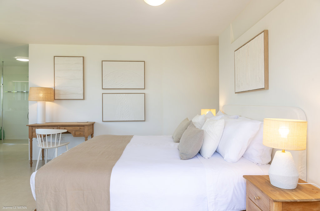 Vue mer, Terrasse privée, Air conditionné, Ventilateur, Lit king size, Dressing, Bureau, TV, Smart TV, Dish, Netflix, Rideaux, Moustiquaire, Coffre-fort.
