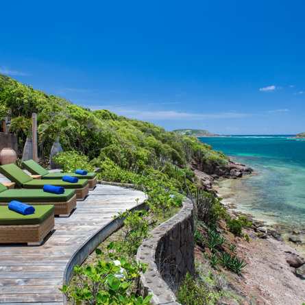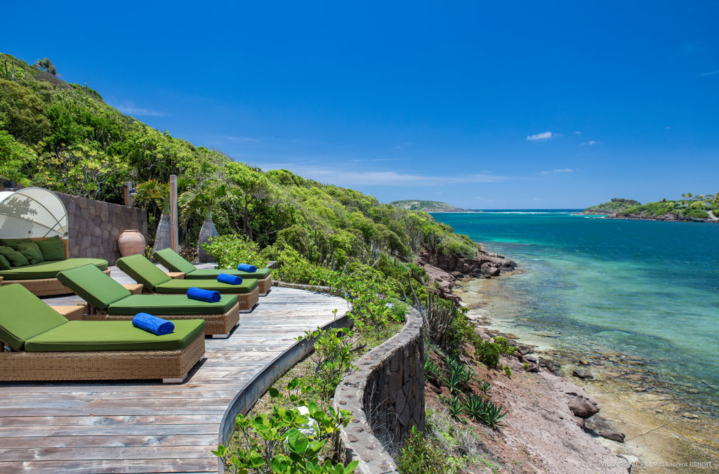 7 chambres avec terrasse privée Chambre 5- Lit King size, télévision, satellite, Apple TV, coffre-fort, dressing, ventilateur, air conditionné, terrasse privée, vue mer. Salle de bain attenante, douche, 2 lavabos, baignoire, douche extérieure, réfrigérateur, Sonos