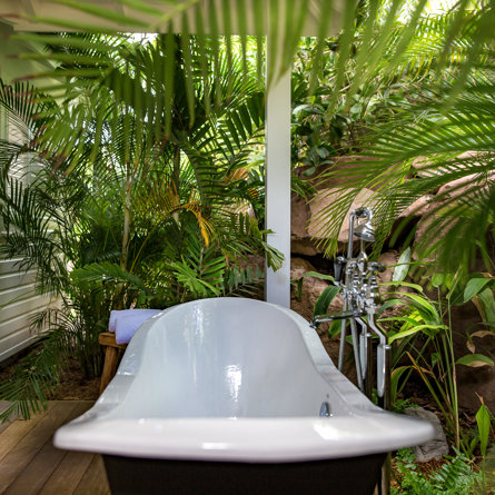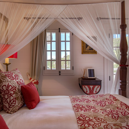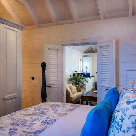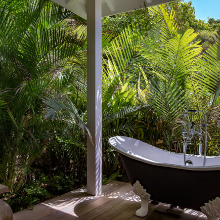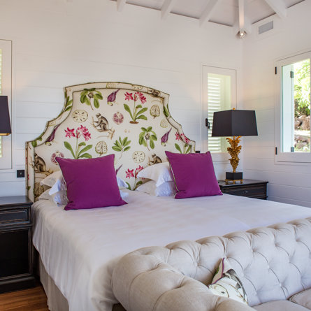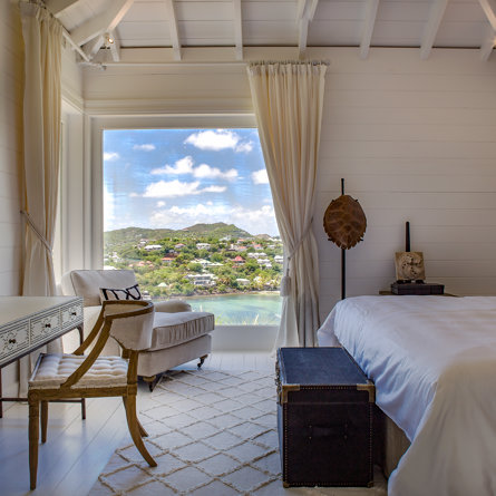 Chambre 6 - Lit King size, télévision, satellite, Apple TV, coffre-fort, dressing, ventilateur, air conditionné, terrasse privée, vue mer. Salle de bain attenante, douche, 2 lavabos, baignoire, douche extérieure, réfrigérateur, Sonos